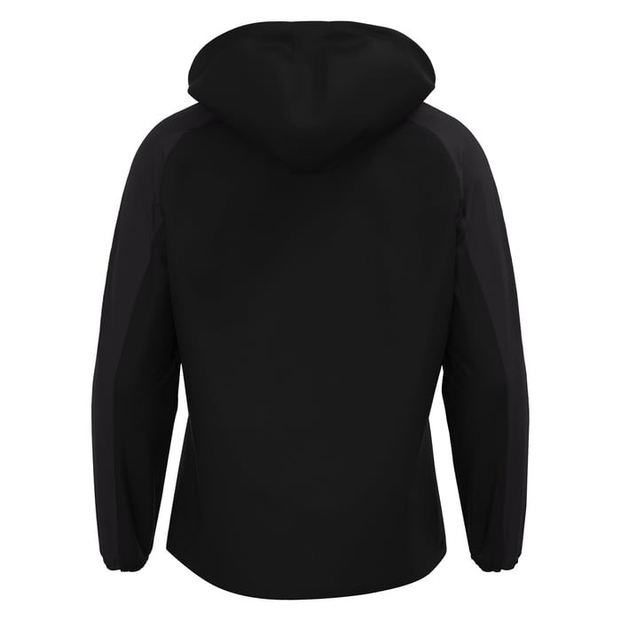 Jacket in water-resistant fabric with mesh lining, waterproof and breathable at the same time. Full-length reversed central zip in nylon, with auto-locking slider. Side pockets with zip closure. Hood packed in collar, elasticated cuffs and drawstring bottom. Tone-on-tone inserts on sleeves.